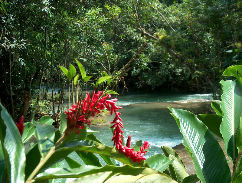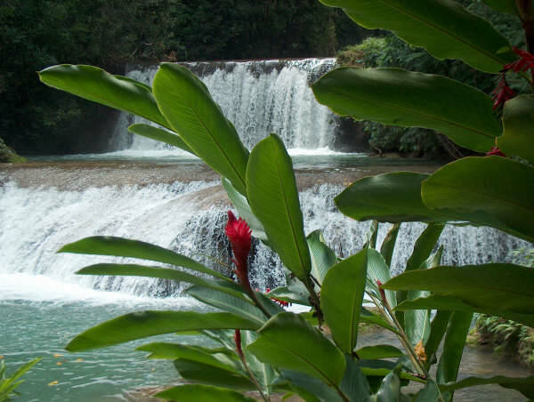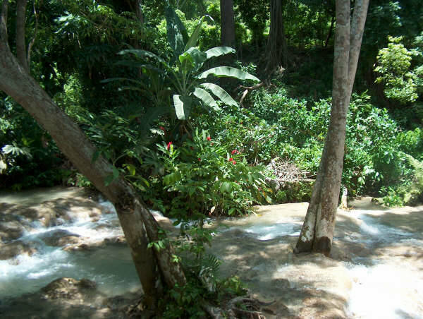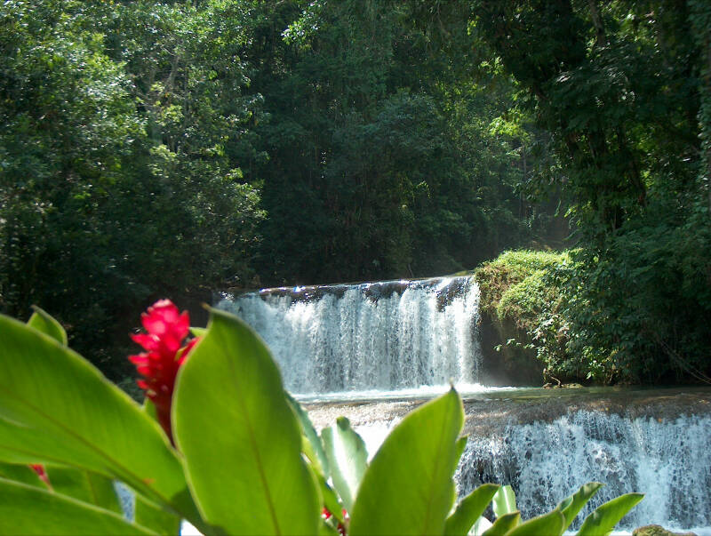 In het achterland van Black River liggen de mooiste watervallen van Jamaica verborgen. Een landweggetje voert langs uitgestrekte plantages naar een parkeerterrein met een kassa. Zoals overal in Jamaica moet voor een mooi plekje betaald worden. De watervallen zijn particulier bezit en kunnen alleen bezichtigd worden met een gids. Vanaf het parkeerterrein brengen tractors met huifkarren ons naar het natuurschoon. Het doel van de rit is een parkachtig terrein aan de voet van de watervallen. Een kabbelende rivier met bloeiende struiken langs de oever, verzorgde gazons en banken nodigen uit tot een gezellig verpozen. De YS rivier stort zich over ongeveer vijftien etages naar het dal. Langs de waterval loopt een verharde weg waaropver we gemakkelijk en droog omhoog kunnen klimmen. Het geheel van een ongerepte tropische natuur in een prachtige vallei te midden van glooiende en dicht met bomen begroeide heuvels en de kristalheldere rivier met zijn watervallen is een wondermooi plaatje.