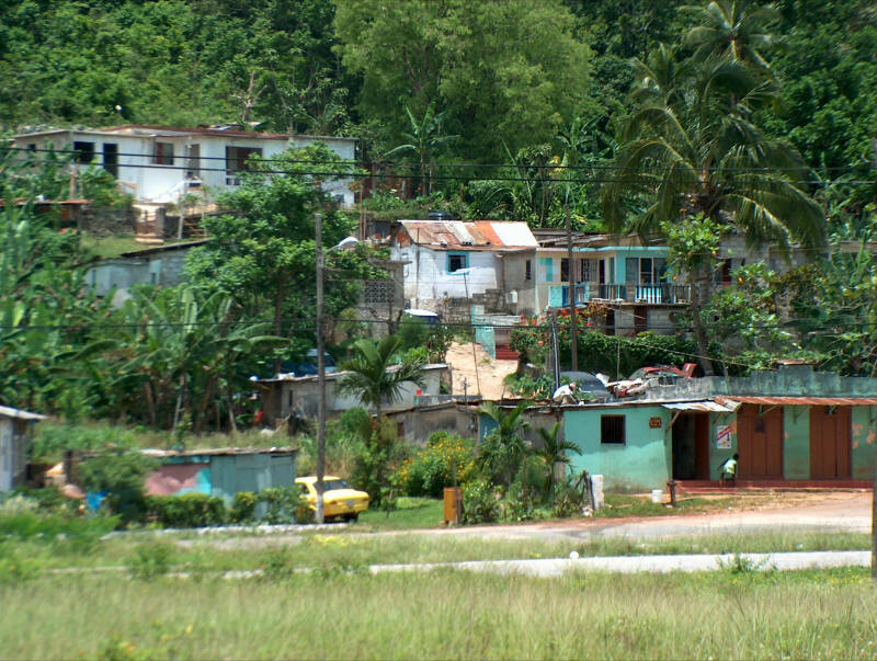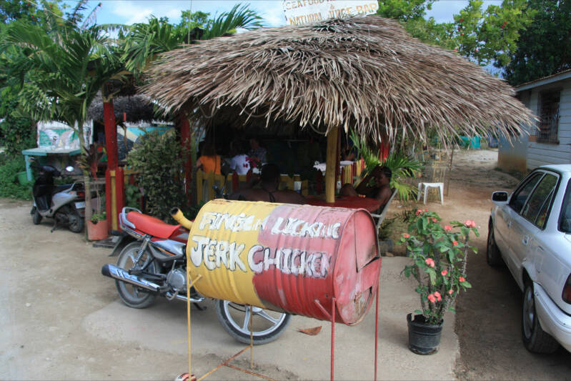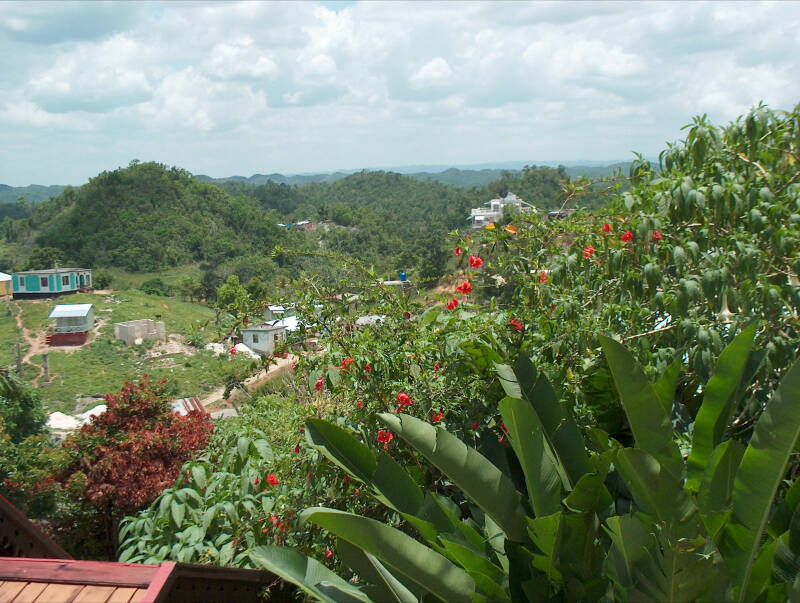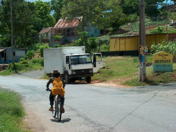 Meteen na het verlaten van de hoofdweg bij Negril wordt de smalle weg nog smaller en het asfalt zit vol kuilen en gaten. Waar nog sprake is van asfalt, vaak is de weg onverhard. Tussen de suikerrietplantages hebben de gebruikers zelf zo goed en zo kwaad als het kan onderhoud aan de weg gepleegd door de gaten wat op te vullen met grind en stenen. We paseren schattige kleine dorpjes met fantasierijk beschilderde hutjes. Wanneer het volgende dorp zich prijsgeeft staat de naam soms op de school. Vrouwen doen de was in de rivier en vervoeren gracieus omvangrijke lasten op hun hoofd. Geiten mekkeren wanneer ze met een noodsprong hun leven redden omdat we proberen de gaten in de weg te omzeilen. Vaak is er een kleurrijke markt in de dorpjes en overal wordt suikerriet in stukken gesneden en als zoete lekkernij verkocht, net als kokosnootwater als goede dorstlesser. De rijkdommen van de tropische natuur zijn bijzonder imposant.