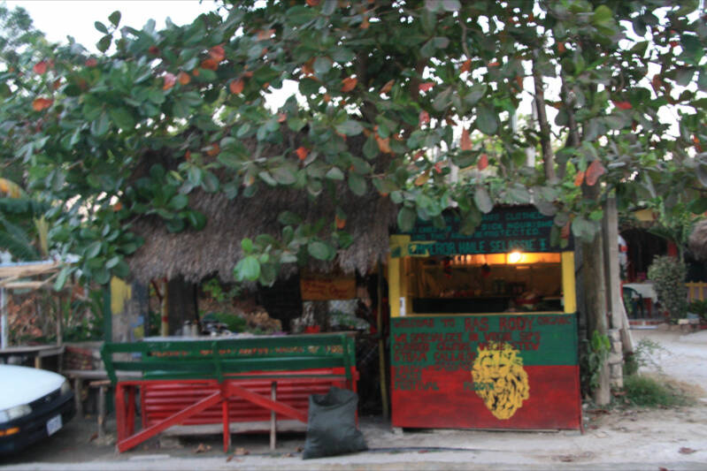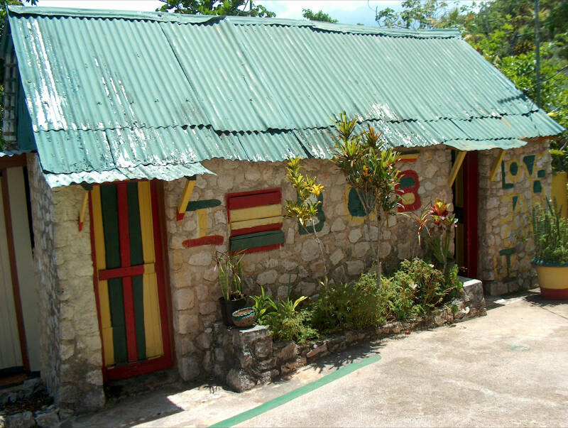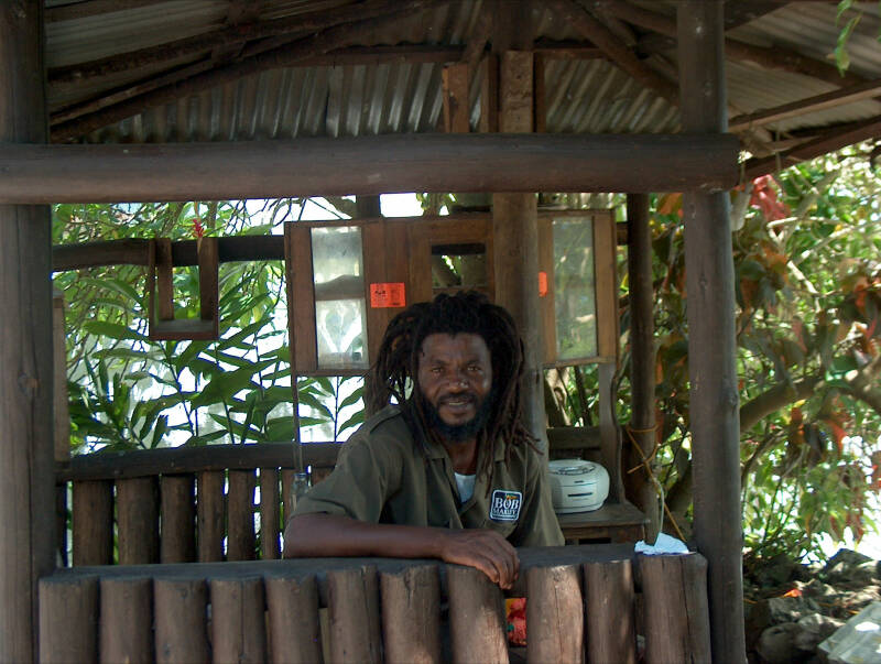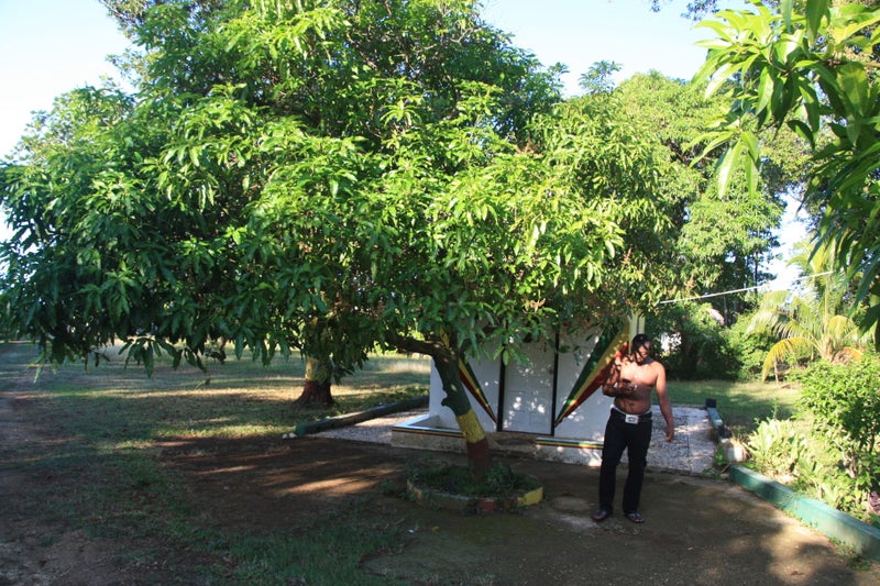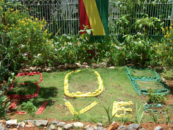 Onder de heuvel van het grafmonument is een café dat druk bezocht wordt door de rastaaanhangers. Door de walm van hasjlucht is duidelijk wat ze hier komen doen. Als we langslopen worden we uitgenodigd voor een kopje thee met ganja en mogen we proeven van de hasj-cake. Waarvoor we vriendelijk bedanken, we willen het helder houden vandaag. In het commerciële oord worden we direkt op sleeptouw genomen door rastafari's die duidelijk de nodige ganja achter de kiezen hebben. Hij rust onder een groot grafmonument van marmer. In de kapel zijn onder meer twee gitaren te zien. Ze maken er een toeristisch feestje van in een bijzonde relaxte sfeer. Maar na de rondleiding hebben we gezien hoe lang de weg naar de roem moet zijn geweest voor een arme jongen uit Nine Mile en begrijpen we meer van het rastafarisme en de bedoeling achter de reggaemuziek.