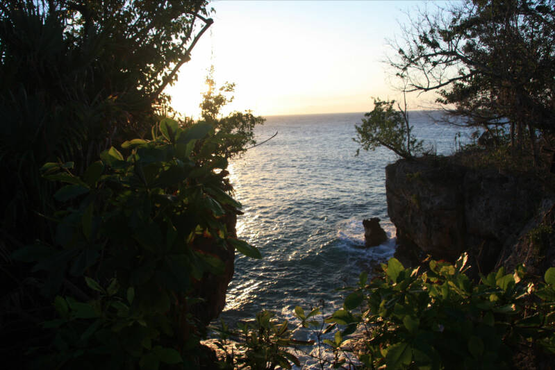 Na de lange zit arriveren we in de avond in Negril. In NL begint de volgende dag alweer bijna, hier is het 6 uur vroeger en hebben we de nacht nog voor de boeg. Na een prima nachtrust gaan we de omgeving verkennen, die er bij daglicht toch weer anders uitziet dan gisterenavond bij aanomst in het donker. Negril ligt aan een 10 km lang zandstrand dat helemaal is volgebouwd met toeristenverblijven, strandbars en resorts. Onze slaapplek is op West End en ligt prachtig op de kliffen boven de zee. In de kleine, rotsige baaien schittert het water in alle nuances blauw. De zonsopgang is er fantastisch. Helaas is het niet mogelijk om hier langs de kust te wandelen, de smalle strook land tussen de weg en de kust is ook hier volgebouwd met privéverblijven, restaurants, bars, souvenirwinkeltjes en hotels. Er zit niks anders op dan langs de weg te lopen, waar we meteen kennis maken met een minder goede eigenschap van de Jamaicanen: hun rijstijl. Hier wandelen is verre van relaxt, het verkeer komt met hoge snelheid en luid toeterend rakelings langs je af gescheurd. Met piepende remmen stopt de ene taxi na de andere om ons een rit aan te bieden (wie gaat er hier nu lopen als je ook met de auto kunt?), worden we nageroepen door verkopers langs de weg of aangehouden door andere voorbijgangers die wat aan ons kwijt willen. Of beter gezegd, zo veel mogelijk dollars willen vangen.